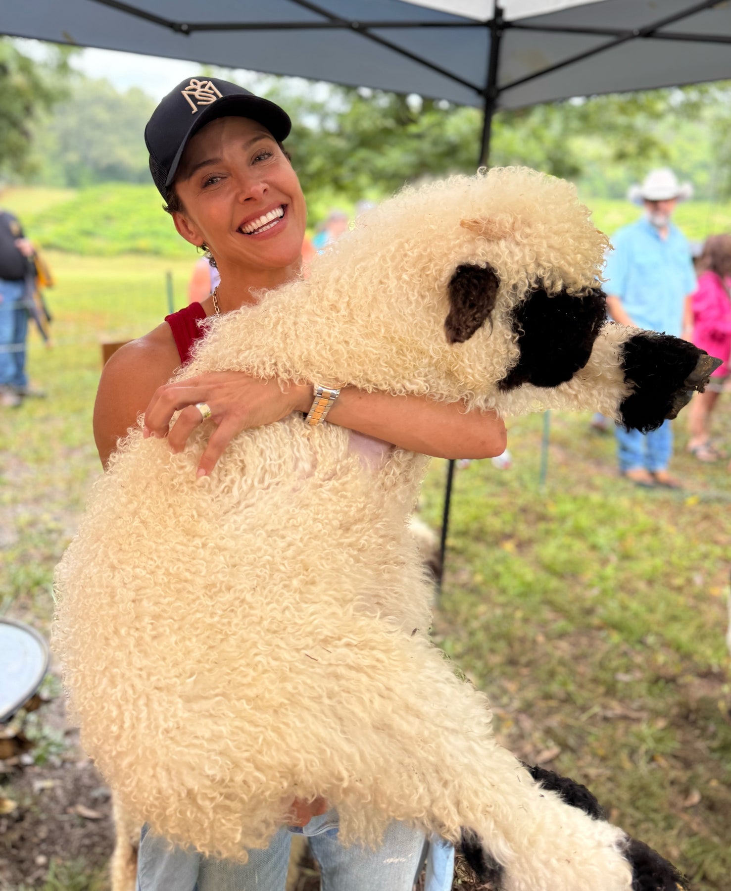 Introducing Magic! Our big boy Sire Black Magic really knocked it out of the park with this beautiful ewe lamb, stamping his look all over this ewe. Not only is this lamb just beautifully marked she's an absolute monster which we love for breeding prospects. She has an unmatched friendly temperament and is always the first lamb in the barn running over for attention. She adore animal crackers and cuddles so we selected her to attend a really cool charity event hosted by Actress Jill Wagner at her family farm called "The Patriotic Pick" supporting the children of fallen special ops warriors. Magic was a total hit at the event and soaked up cuddles with Jill, her celebrity friends and about 600 guests. If you're looking for a very special temperament for a family friendly ewe this ewe is it!